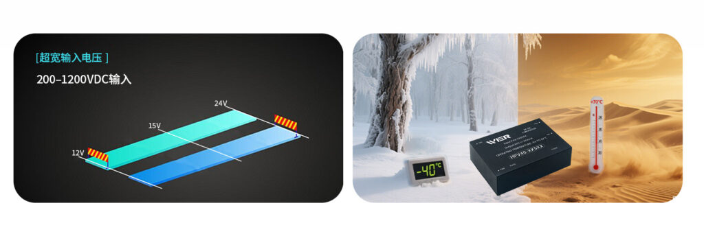 支持 200–1200VDC 输入,轻松应对光伏系统中因光照波动引起的电压剧烈变化,无需额外稳压电路,简化系统设计。
